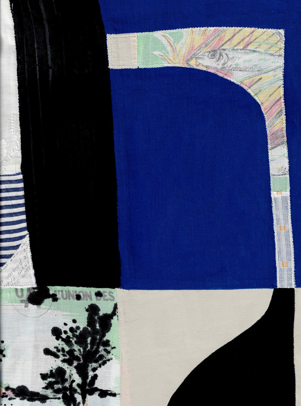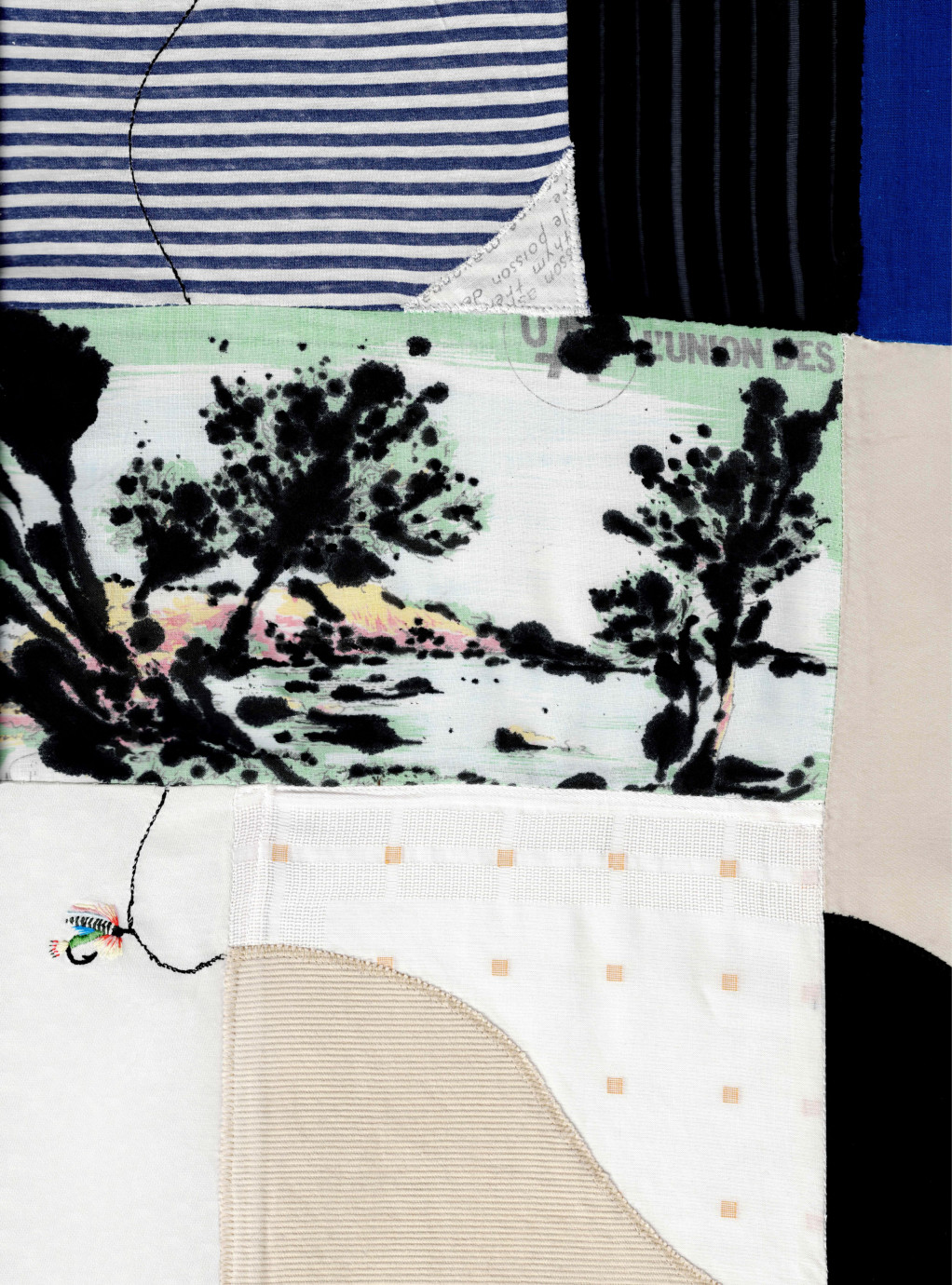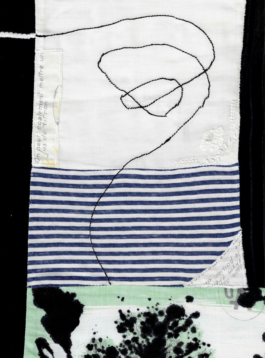 Composition textile réalisée à partir de tissus trouvés et collectionnés, dont un torchon de recette datant de 1976, qui nous explique comment cuisiner le loup grillé au fenouil.