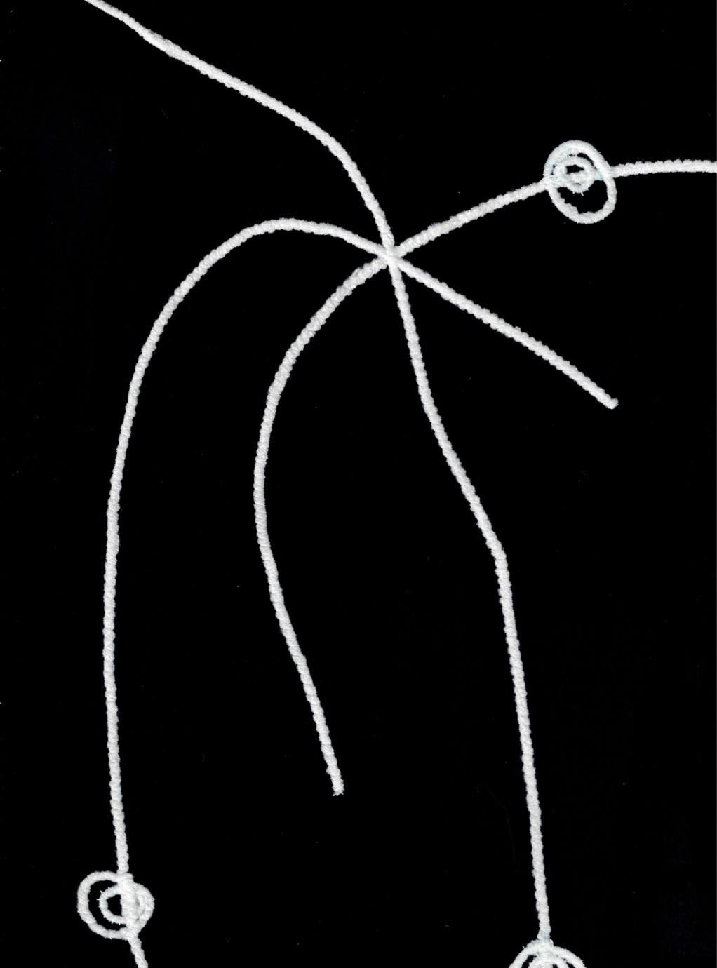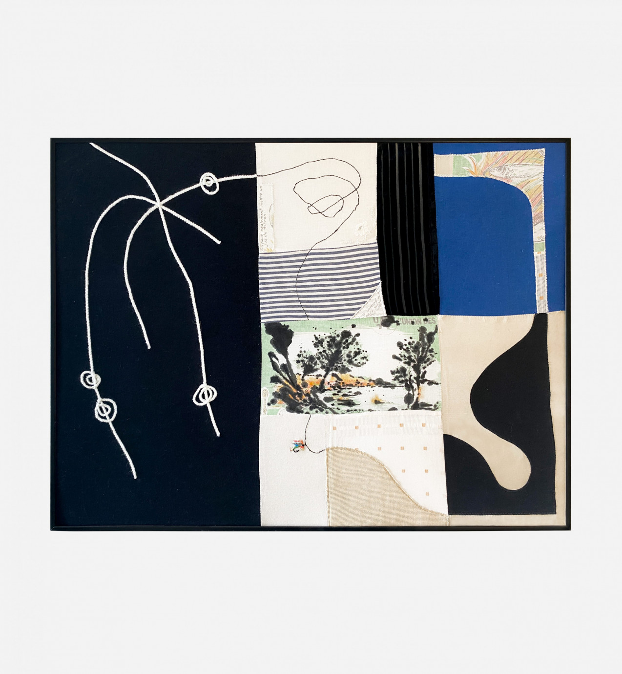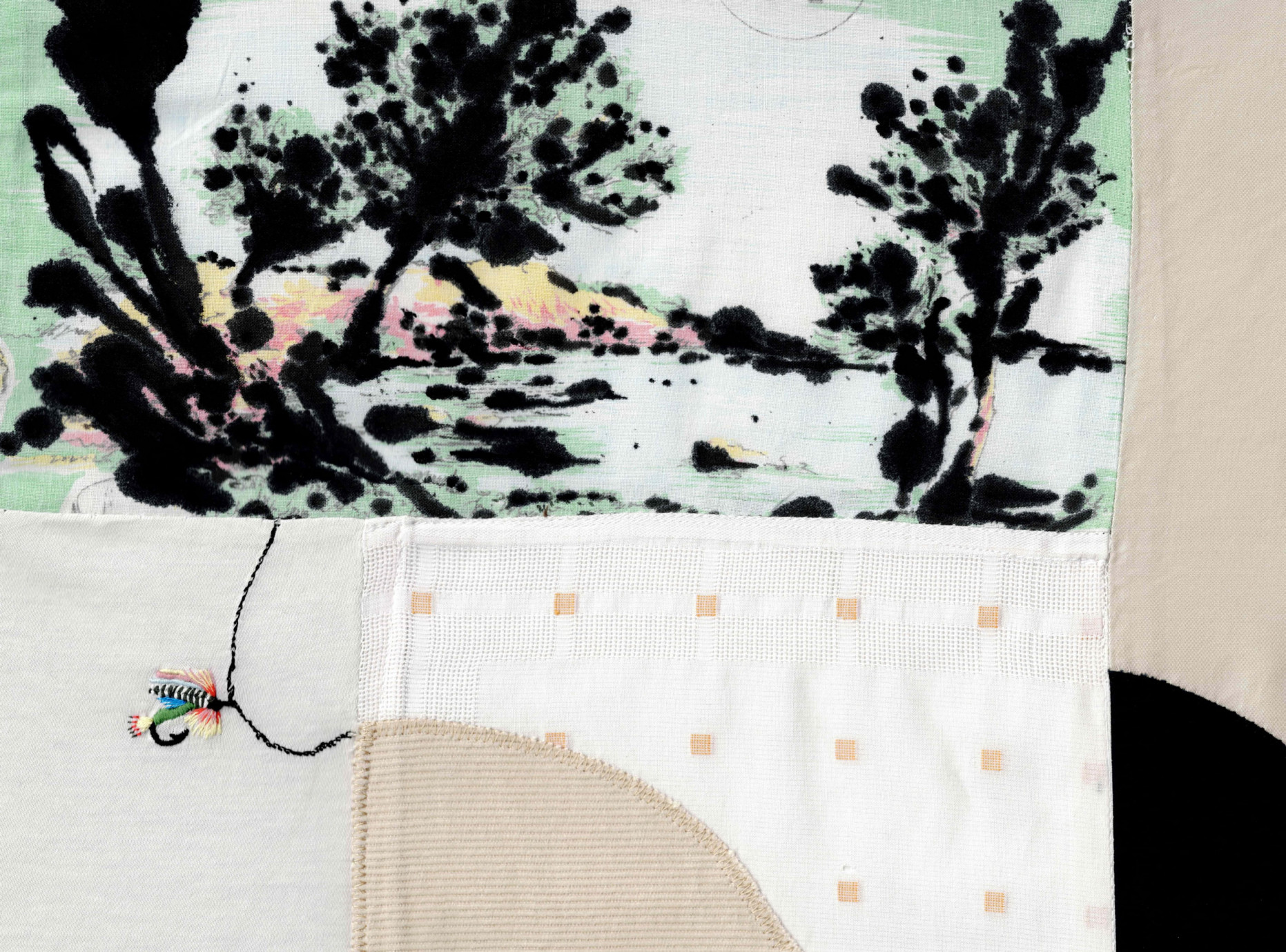 Composition textile réalisée à partir de tissus trouvés et collectionnés, dont un torchon de recette datant de 1976, qui nous explique comment cuisiner le loup grillé au fenouil.